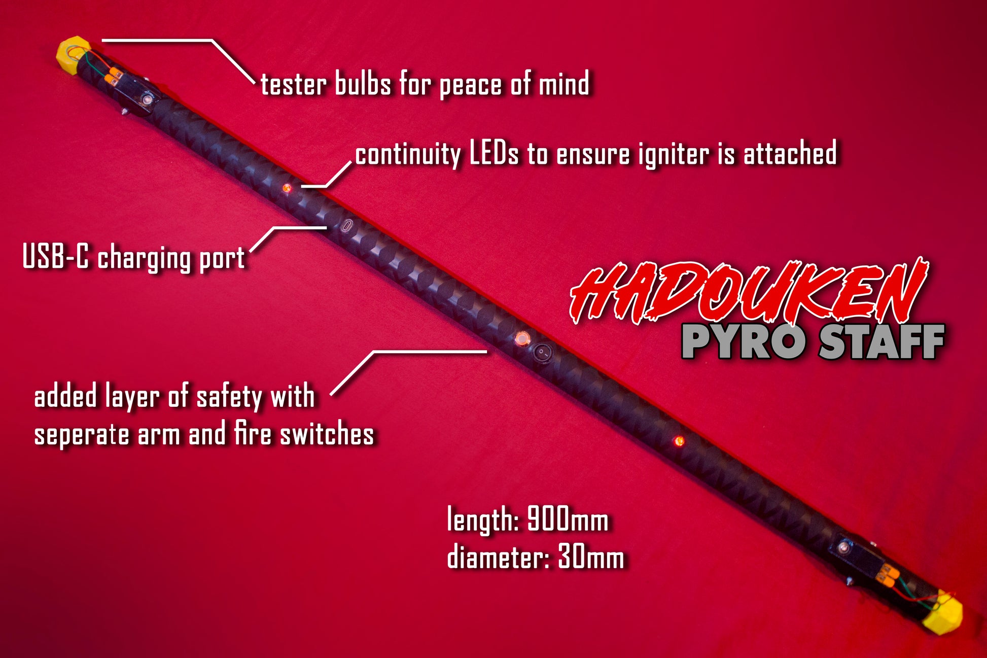 The HadoukenPYRO Staff was designed for safety, reliability and style by a small team of experienced engineers in Bristol.